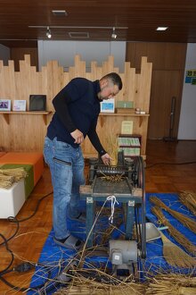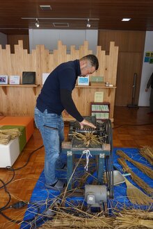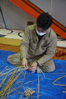 2本の藁束を手のひらで巻き合わせて、1本の紐にする作業です。